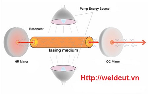 Khi năng lượng được cộng thêm vào hệ thống, quỹ đạo của các điện tử (electron) của nguyên tử trong gain medium bị kích thích để tạo năng lượng cao hơn. Khi năng lượng hình thành phân rã, các photon có cùng bước sóng. Tuy nhiên, chỉ có những photon được phát ra song song chính xác với trục của buồng quang (resonator) thì được phản xạ lại gain medium bởi kính phản xạ toàn phần hay còn gọi là HR (highly reflective) và kính phản xạ bán phần- OC (output coupler), gây ra một tầng photon có cùng hướng, độ phân cực và pha (phase).