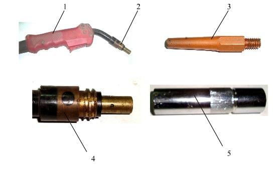 Cấu tạo mỏ hàn gồm: 1. Thân súng hàn mig-mag, 2. nối bép pana, 3. bép hàn. 4. cách điện, 5. chụp khí.